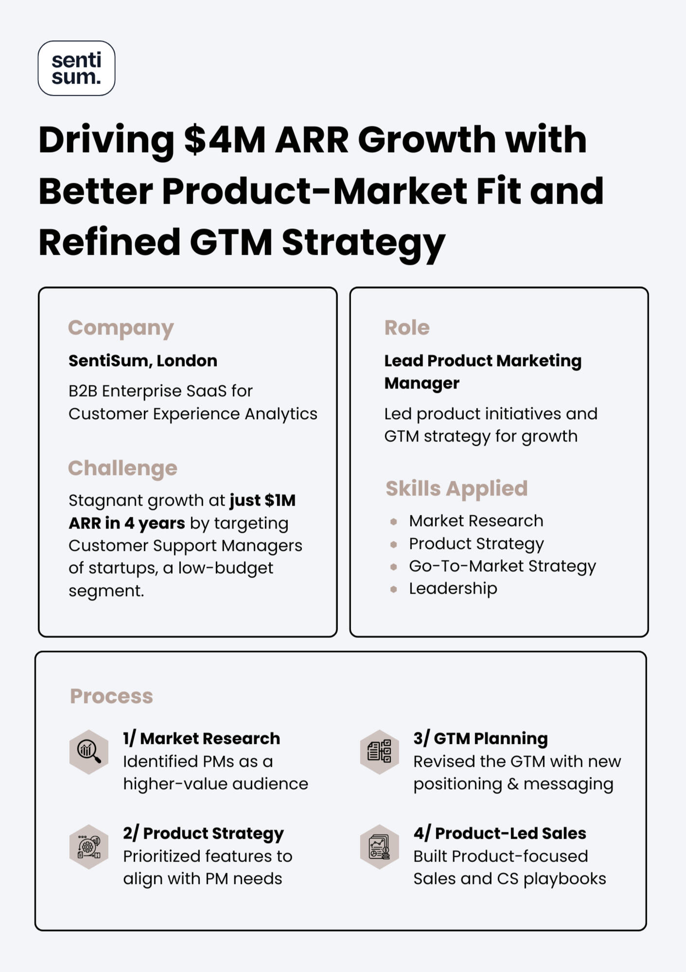 SentiSum, London⬢ Lead Product Marketing Manager (Apr '22 to Apr '24)Shaped product direction and revamped GTM strategy, driving ARR growth from $1M to $5M in 2 years.