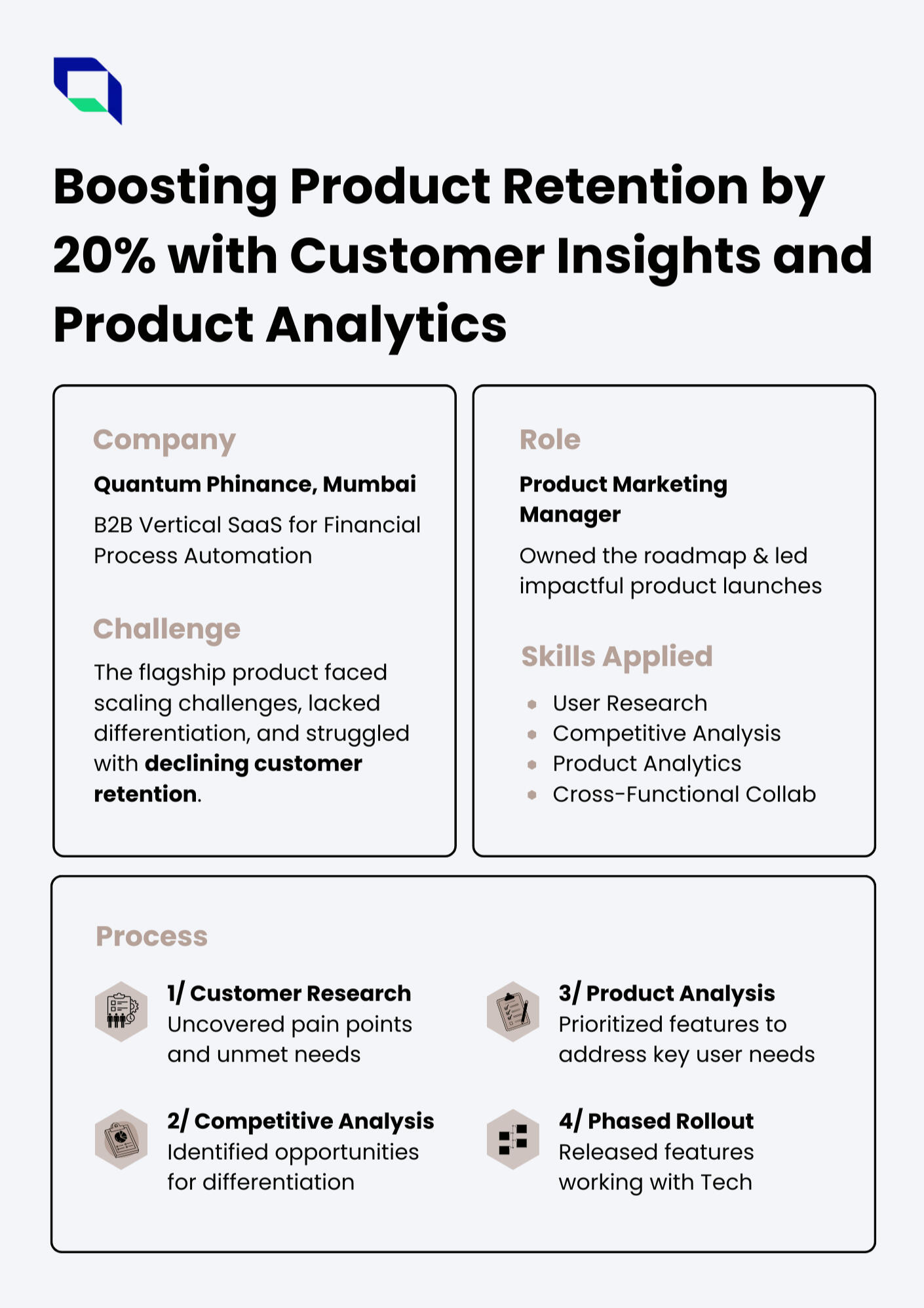 Quantum Phinance, Mumbai⬢ Product Marketing Manager (June '18 to Mar '22)Defined product roadmap and led product launches, improving customer retention by 20%