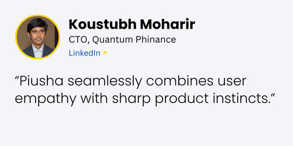 Quantum Phinance, Mumbai⬢ Product Marketing Manager (June '18 to Mar '22)Defined product roadmap and led product launches, improving customer retention by 20%
